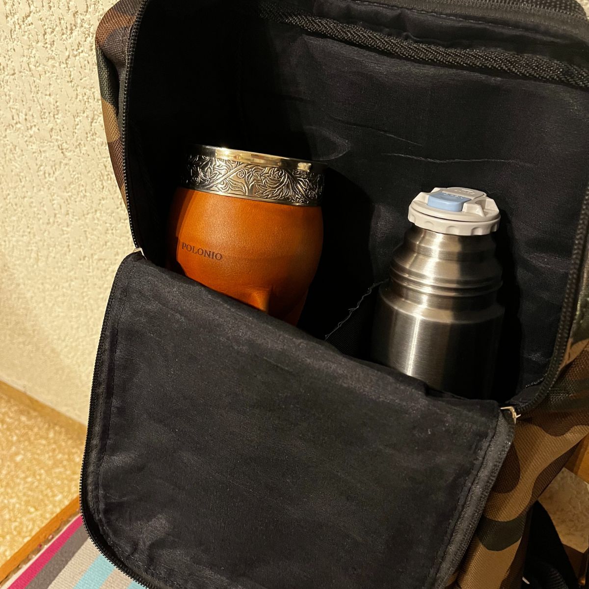 Este bolso matero fue diseñado exclusivamente para que no tengas que usar otra mochila o cartera para llevar algo extra a tus mateadas. Entra un termo Stanley grande.